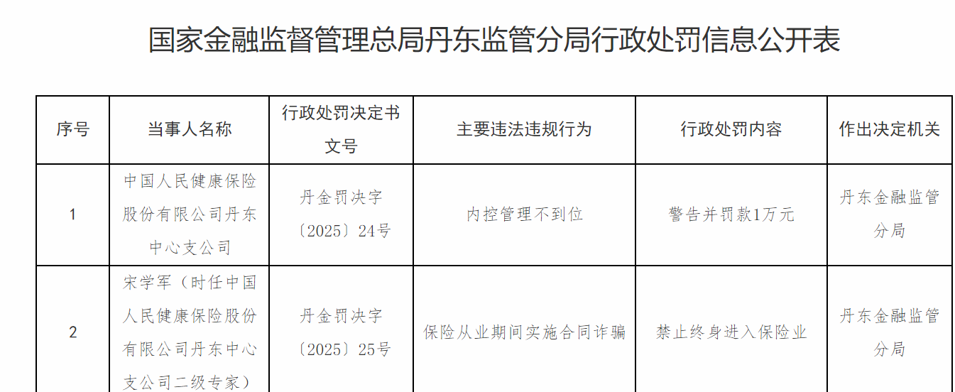 每日更新PICC Health Dandeng Central分支机构被内部控制逃生所罚款,并且由于合同欺诈而禁止前高管一生 由admin打开2025年8月12日2025年8月12日对“PICC Health Dandeng Central分支机构被内部控制逃生所罚款,并且由于合同欺诈而禁止前高管一生”作出评论 8月11日,警告说,警告了中国的丹吉·中央人民健康保险公司有限公司,对国家政府进行财政监督的danguong监督部门的行政处罚形式被警告,并罚款10,000元人民币,以实施不足的内部控制管理。 Song(中国人民健康保险有限公司的丹东中央分支机构的第二层专家)由于保险业业务期间的合同欺诈而被禁止进入人寿保险行业。